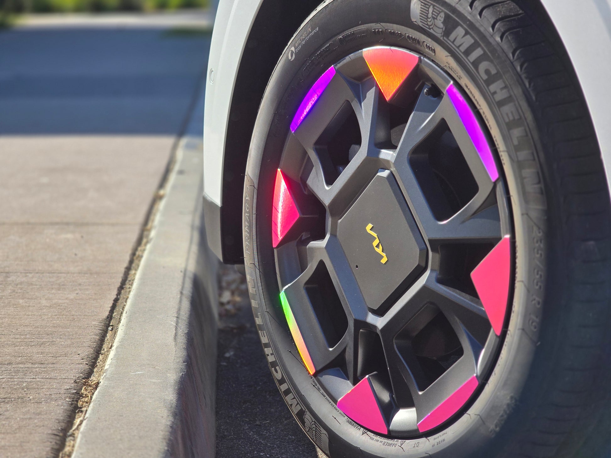 Kia Logo + Rim Decal Set: Includes 5x Kia logo decals plus rim decals (all four wheels covered). 1x spare Kia logo & 2x spare individual decals included.